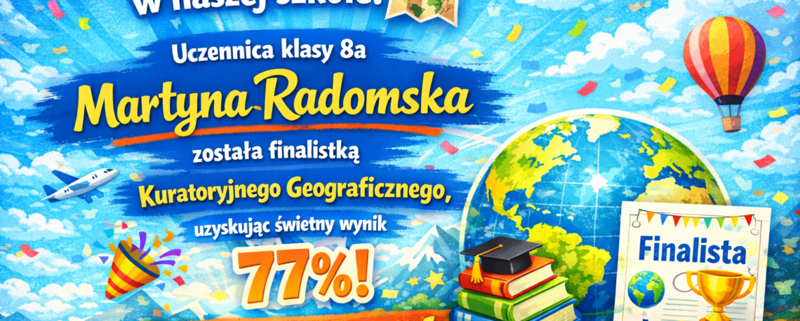 Uczennica klasy 8a Martyna Radomska została finalistką kuratoryjnego Konkursu Geograficznego, uzyskując świetny wynik 77%!
